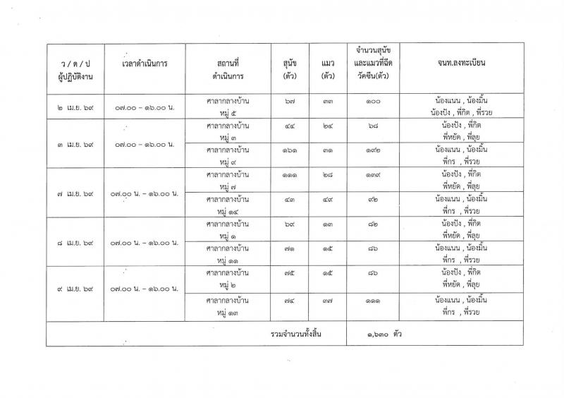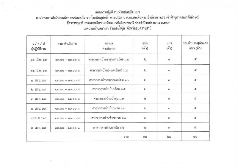 description แผนตารางการออกฉีดวัคซีนป้องกันโรคพิษสุนัขบ้าให้กับสัตว์เลี้ยง(สุนัข-แมว) ในเขตพื้นที่เทศบาลตำบลตาเกาประจำปี 2569 (วัน เวลา สถานที่ รายละเอียดตามตาราง) -สิ่งที่ต้องนำมาคือสัตว์เลี้ยง+บัตรประจำตัวประชาชนนำมาลงทะเบียนที่ประชาคมของแต่ละหมู่บ้าน(ฉีดฟรี) person admin