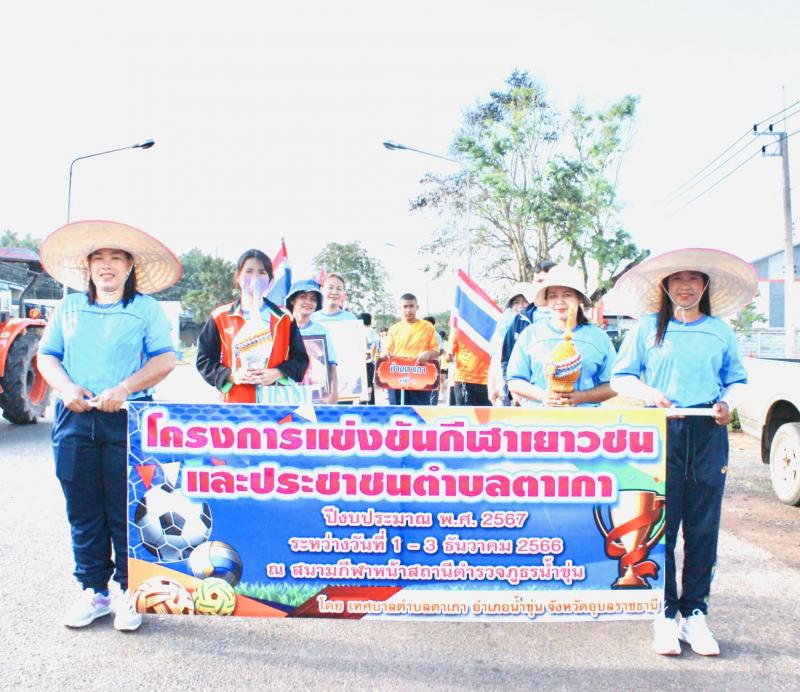 description วันที่ 1 ธันวาคม 2566 เทศบาลตำบลตาเกาจัดโครงการแข่งขันกีฬาเยาวชนและประชาชนตำบลตาเกา ปีงบประมาณ พ.ศ. 2567 ระหว่างวันที่ 1 -3 ธันวาคม 2566 ณ สนามกีฬาหน้าสถานีตำรวจภูธรอำเภอน้ำขุ่น อำเภอน้ำขุ่น จังหวัดอุบลราชธานี โดยได้รับเกียรติจากนายอำเภอน้ำขุ่น นางใจทิพย์ ภาษีผล นายอำเภอน้ำขุ่น เป็นประธานในพิธีเปิด และขอบพระคุณหน่วยงานทุกภาคส่วนราชการที่ให้การสนันสนุนการแข่งขันกีฬาในปีงบประมาณครั้งนี้ด้วยค่ะ person admin