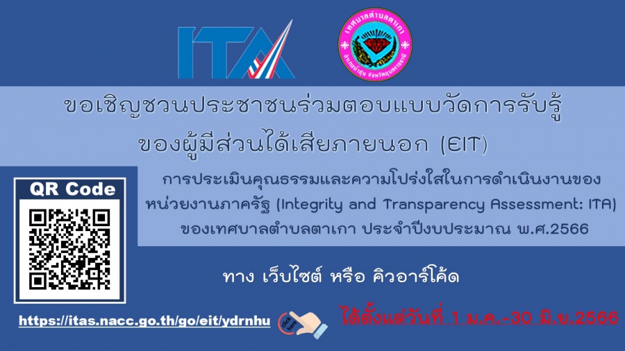 ขอเชิญชวนประชาชนร่วมตอบแบบวัดการรับรู้ ของผู้มีส่วนได้เสียภายนอก (EIT) การประเมินคุณธรรมและความโปร่งใสในการดำเนินงานของหน่วยงานภาครัฐ (Integrity and Transparency Assessment: ITA) ของเทศบาลตำบลตาเกา ประจำปีงบประมาณ พ.ศ.2566