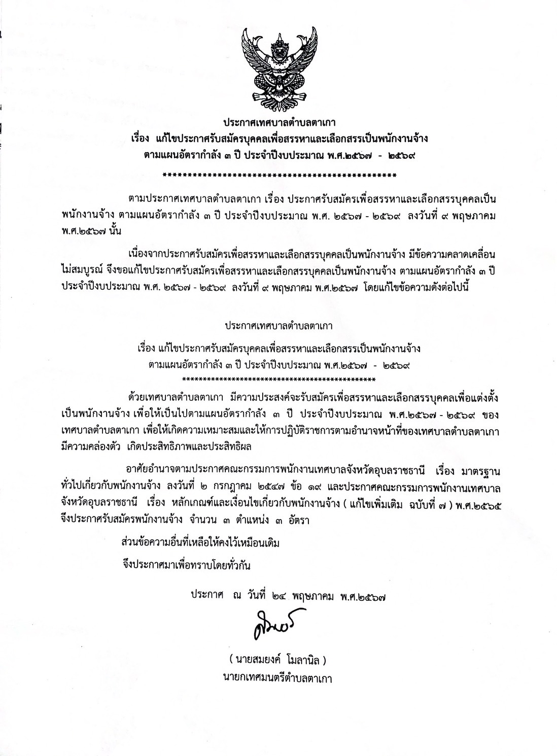 เรื่องแก้ไขประกาศรับสมัครบุคคลเพื่อสรรหาเป็นพนักงานจ้างตามแผนอัตรากำลัง 3 ปี ประจำปีงบประมาณ พ.ศ.2567 - 2569