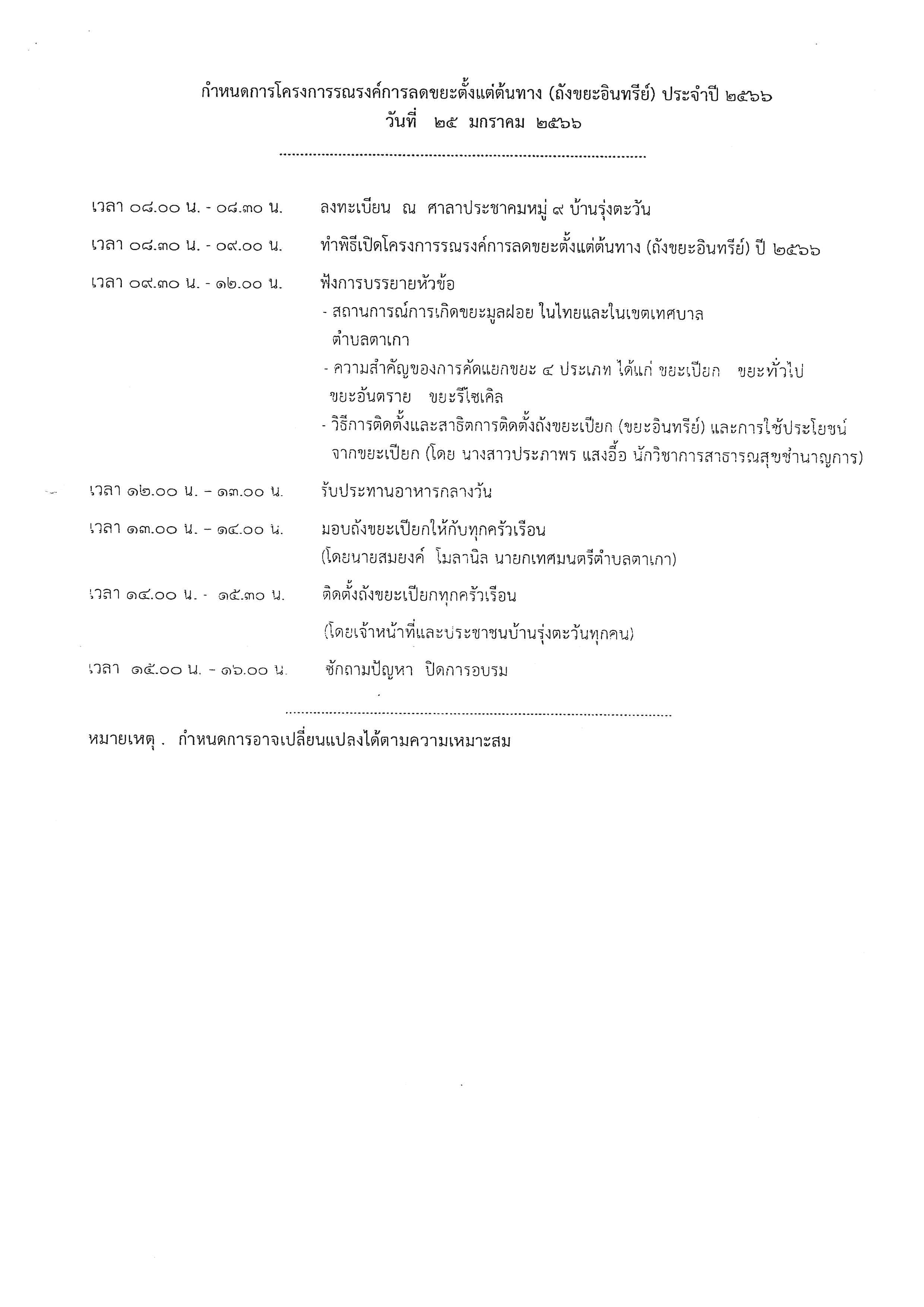 ขอเชิญ บ้านรุ่งตะวันหมู่9 บ้านหมากแหน่งใต้หมู่10 เข้าร่วมโครงการรณรงค์การลดขยะต้นทาง (ถังขยะอินทรีย) ปี 2566 ในวันที่ 25 มกราคม 2566