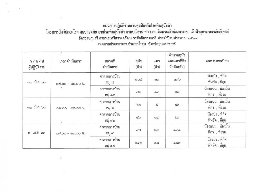 แผนตารางการออกฉีดวัคซีนป้องกันโรคพิษสุนัขบ้าให้กับสัตว์เลี้ยง(สุนัข-แมว) ในเขตพื้นที่เทศบาลตำบลตาเกาประจำปี 2569 (วัน เวลา สถานที่ รายละเอียดตามตาราง) -สิ่งที่ต้องนำมาคือสัตว์เลี้ยง+บัตรประจำตัวประชาชนนำมาลงทะเบียนที่ประชาคมของแต่ละหมู่บ้าน(ฉีดฟรี)
